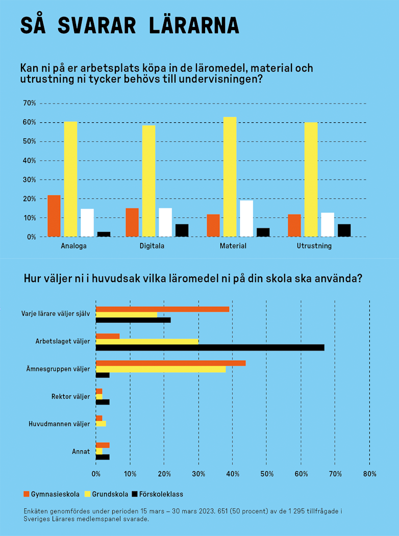 I Sveriges Lärares undersökning anger cirka 20 procent av de medlemmar som deltagit att de inte kan köpa in något alls eller att de inte kan köpa in det nödvändigaste. Mönstret är detsamma inom alla skolformer och gäller oavsett om det rör sig om analoga läromedel, digitala läromedel, material eller utrustning.