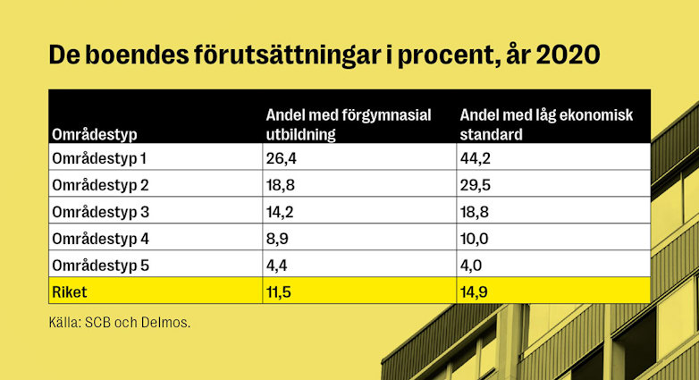 Skolsegregationen i Sverige går åt fel håll. Det visar siffror från Delegationen mot segregation (Delmos), i myndighetens årsrapport 2022. Den visar att sex av tio 19-åringar, i bostadsområdena med störst socioekonomiska utmaningar, inte slutförde gymnasiet med en examen. Redan i grundskolan föll 36 procent av niondeklassarna från de mest segregerade områdena bort, eftersom de inte var behöriga att söka till gymnasieskolans nationella program. Värst såg det ut för pojkarna. När man följde upp ungdomarna vid 34-års ålder så saknade nästan 4 av 10 sysselsättning, av de som inte hade klarat gymnasiet.