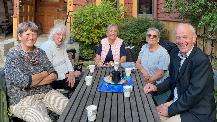 Återträffen som nyligen ägde rum. Från vänster: Gunnel Öhlin (tidigare Edberg), 80, Barbro Thörnelöf, 96, Wera Bergius (tidigare Lindberger), 79, Ingela Jung, 80 och Tom Appelgren, 80. Foto: Privat
