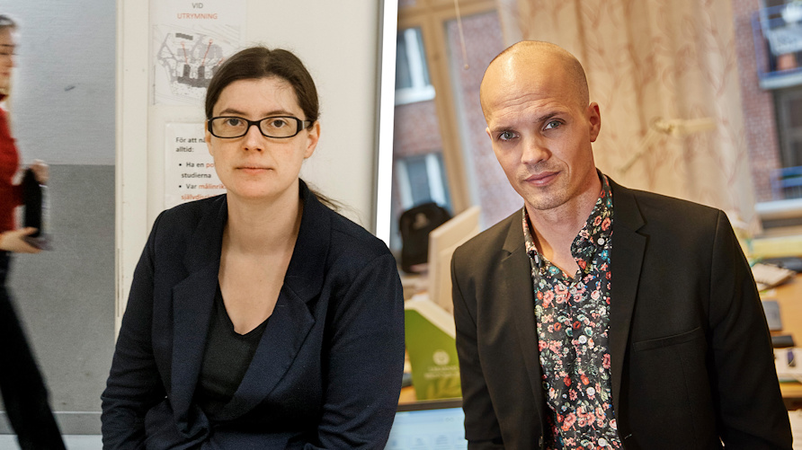 Helena Dübeck, Sveriges Lärare Uppsala, och Johan Åström, Sveriges Lärare Malmö, vittnar om hur nedskärningarna slår mot skolverksamheten. Foto: Andreas Hillergren och Staffan Claesson