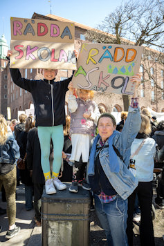 Madelene Evertsson med sina barn Eira, 9 och Idde, 6, var med under demonstrationen. Foto: Sven Lindwall
