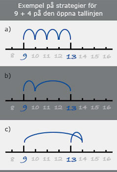 – För att räkna ut 9 + 4 räknar vissa elever på fingrarna för att ett hopp i taget komma fram till 13 (exempel a). Andra räknar först upp till 10 och lägger sedan på tre (exempel b). En tredje tänker att ”det är ungefär som 10 + 4” och sedan drar de bort 1 (exempel c).