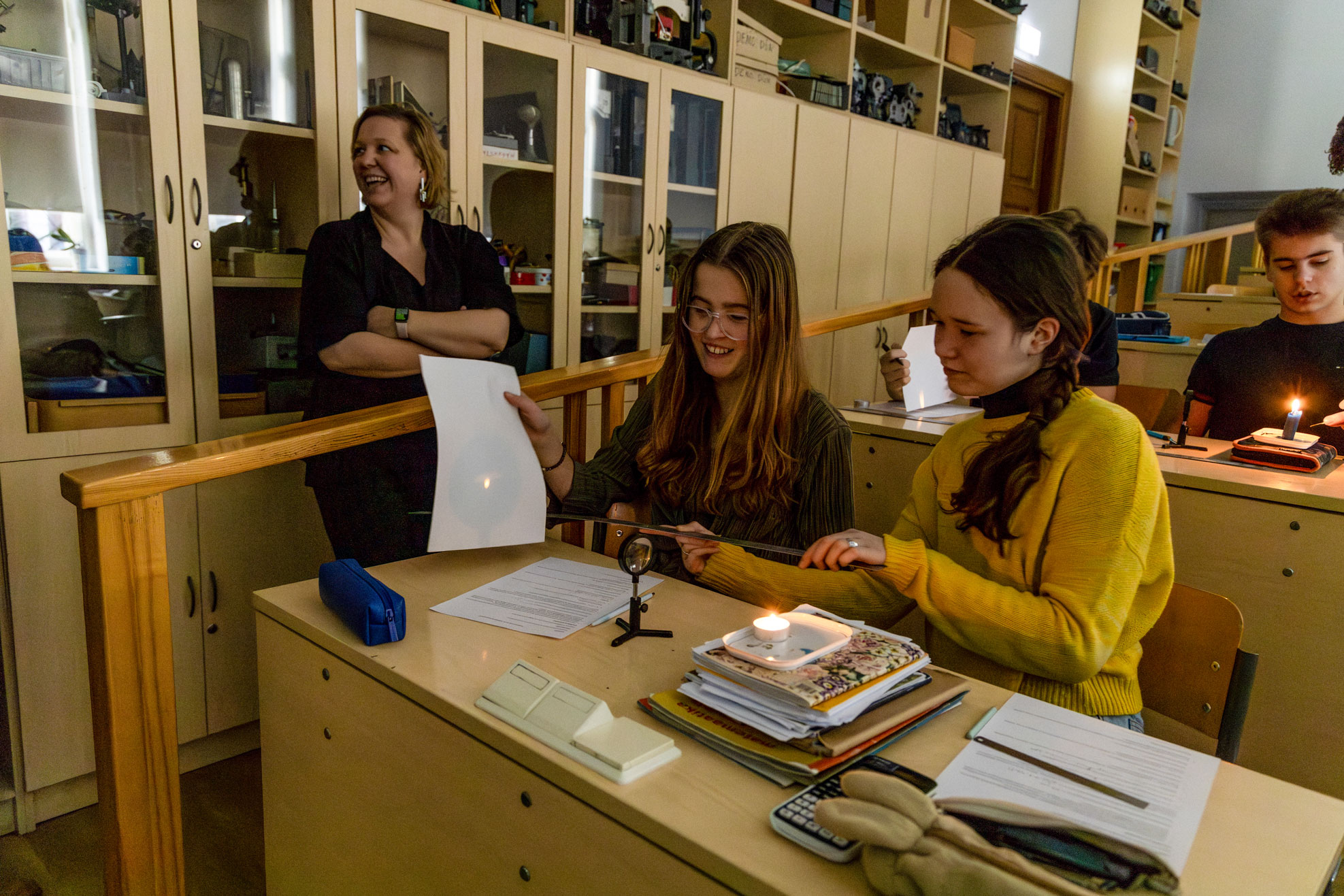 Efter lunch får vi vara med på hans lektion i årskurs 8 på temat geometrisk optik. Gardinerna är fördragna, de levande ljusen på elevernas bänkar ger julmysig stämning.