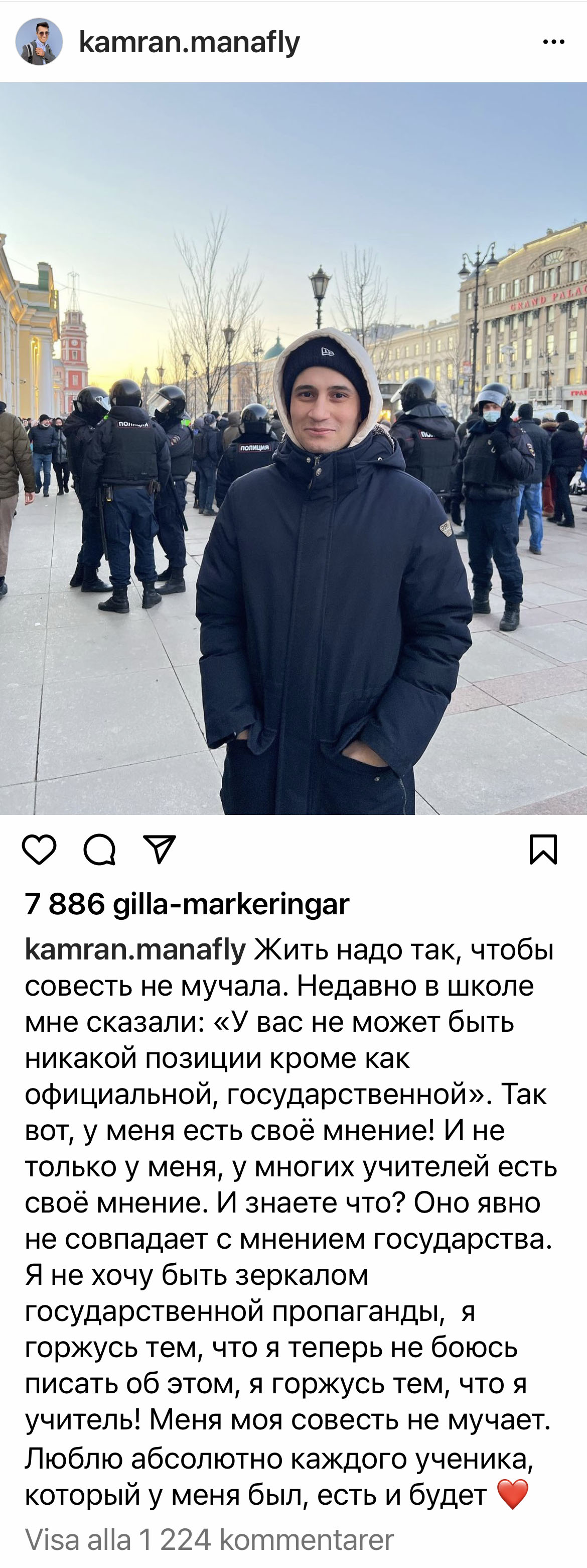Kamran Manafly inte bara vägrade. Han skrev ett personligt Instagraminlägg, som Aftonbladets ryskspråkige reporter Joachim Kerpner översatt: