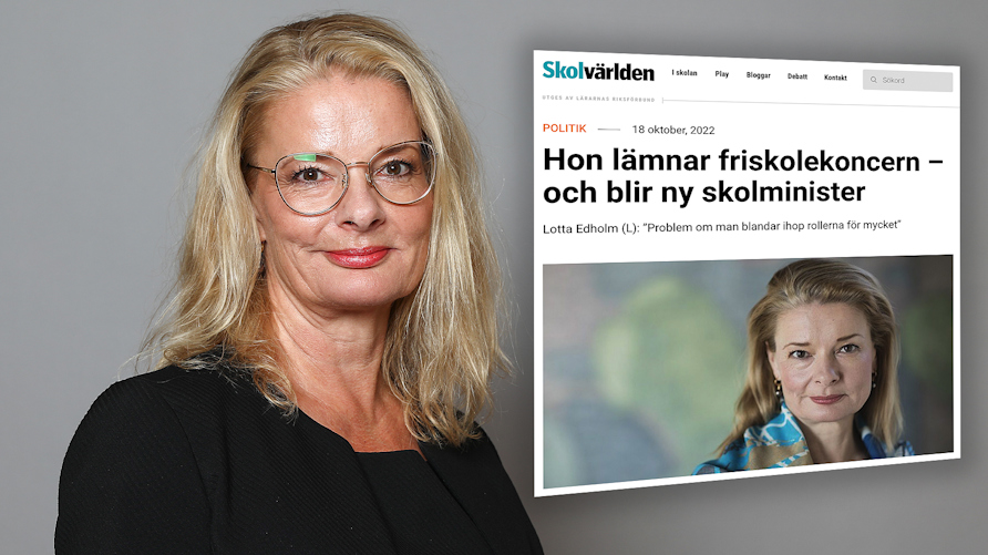 När Skolvärlden en vecka före ministerutnämnandet frågar Lotta Edholm om hon har nytta av sina politiska kontakter i arbetet som styrelseledamot i en friskolekoncern svarar hon: