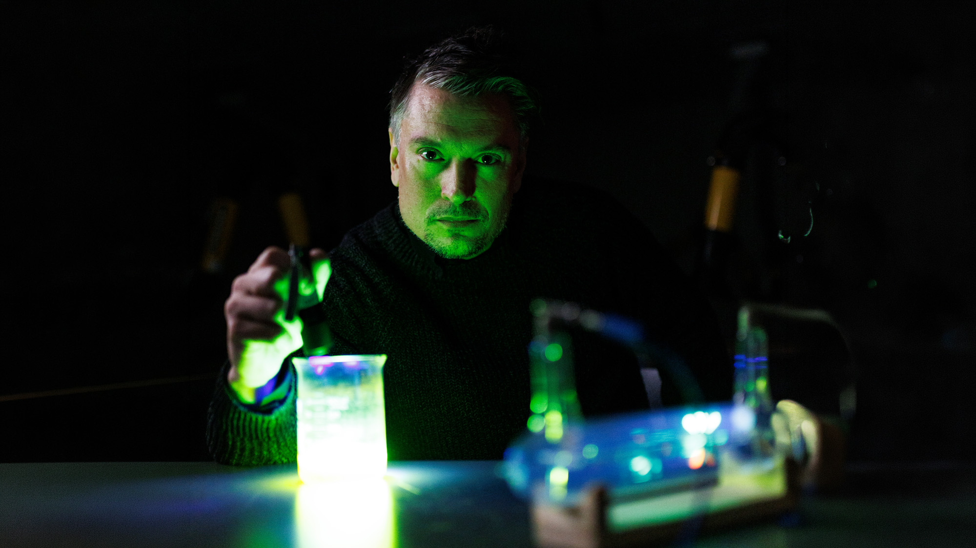 Kristoffer Åberg gör en spektralanalys: kopplar in rör till en högspänningskälla för att undersöka ”fingeravtrycket” från ämnet som ger ifrån sig ljuset.