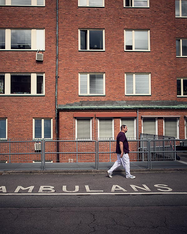 Han är klädd i gympadojor av ett tyskt välkänt märke. Han bär vita sjukhusbyxor och en lila blus eller tunika. Färgen på tunikan anger att han är sjukhuslärare, en av de tretton som verkar i Göteborg fördelade på sex olika arbetsplatser.