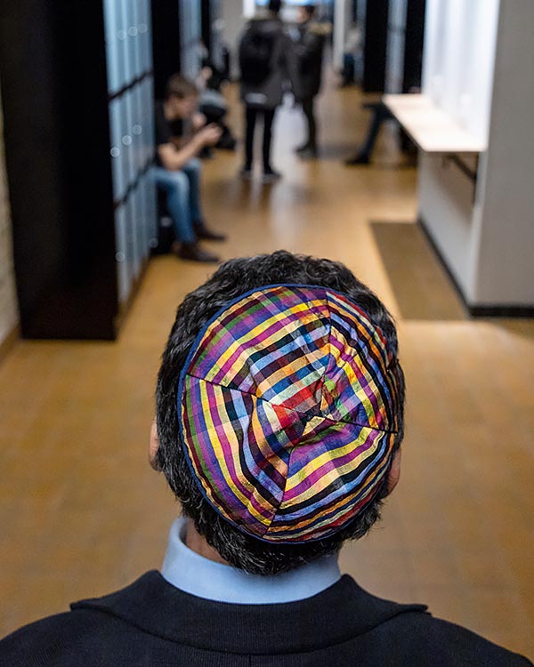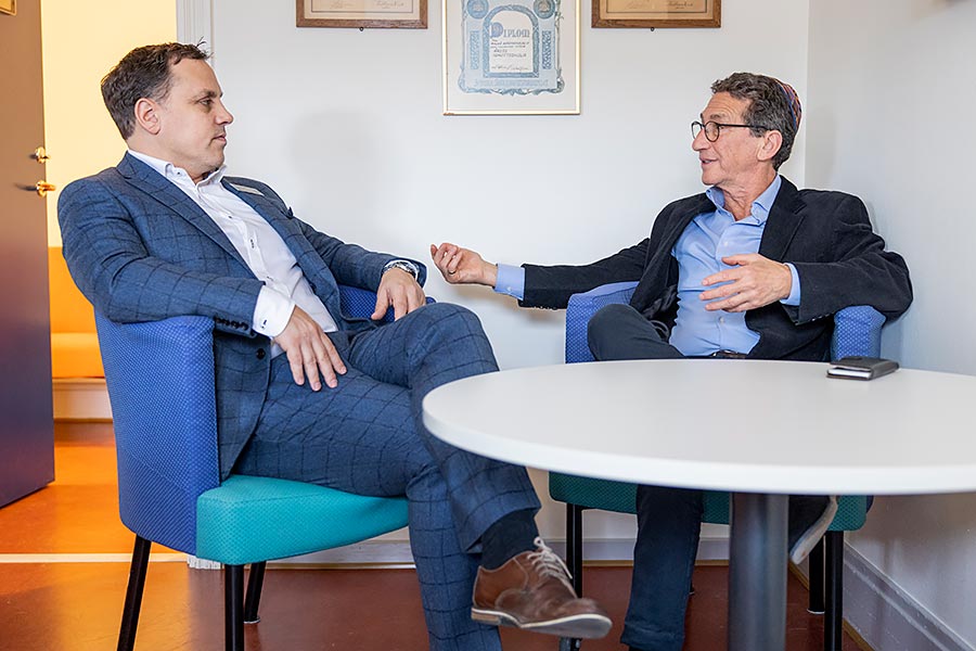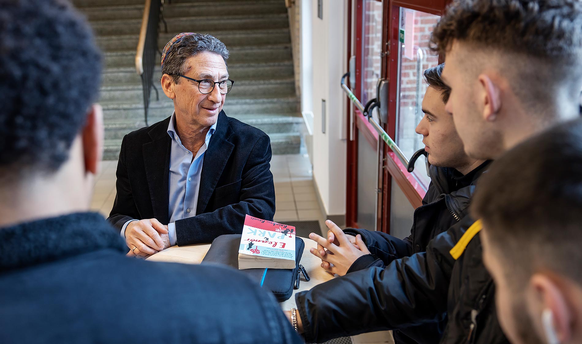 – Samtalen kan handla om allt möjligt. I går satt jag med tre killar från årskurs tre som pratade om framtidsdrömmar. Ofta kommer vi in på min bakgrund. Jag berättar att jag är jude och visar min kippa som jag alltid bär med mig.