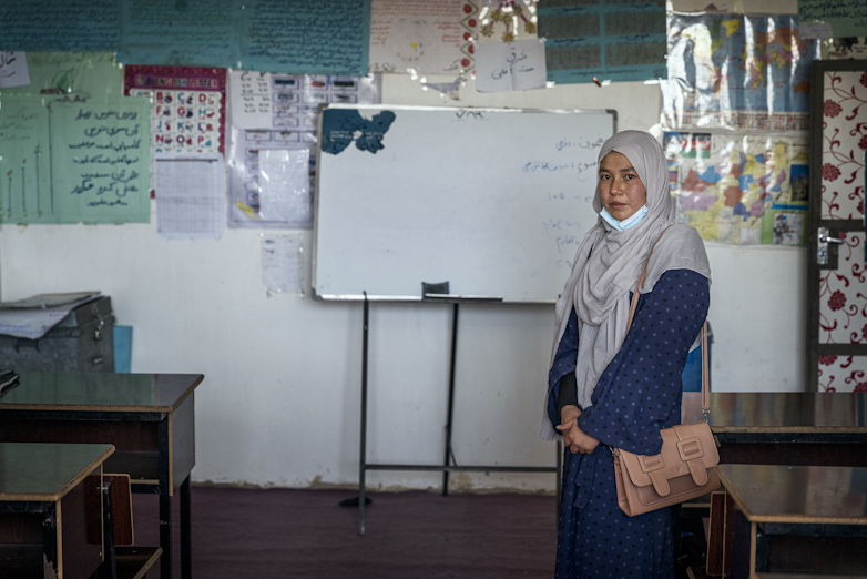 – När talibanerna tog makten stängde skolan i tre månader. Jag grät och tänkte att jag aldrig skulle få återvända till klassrummet, säger hon och drar snabbt upp munskyddet igen.