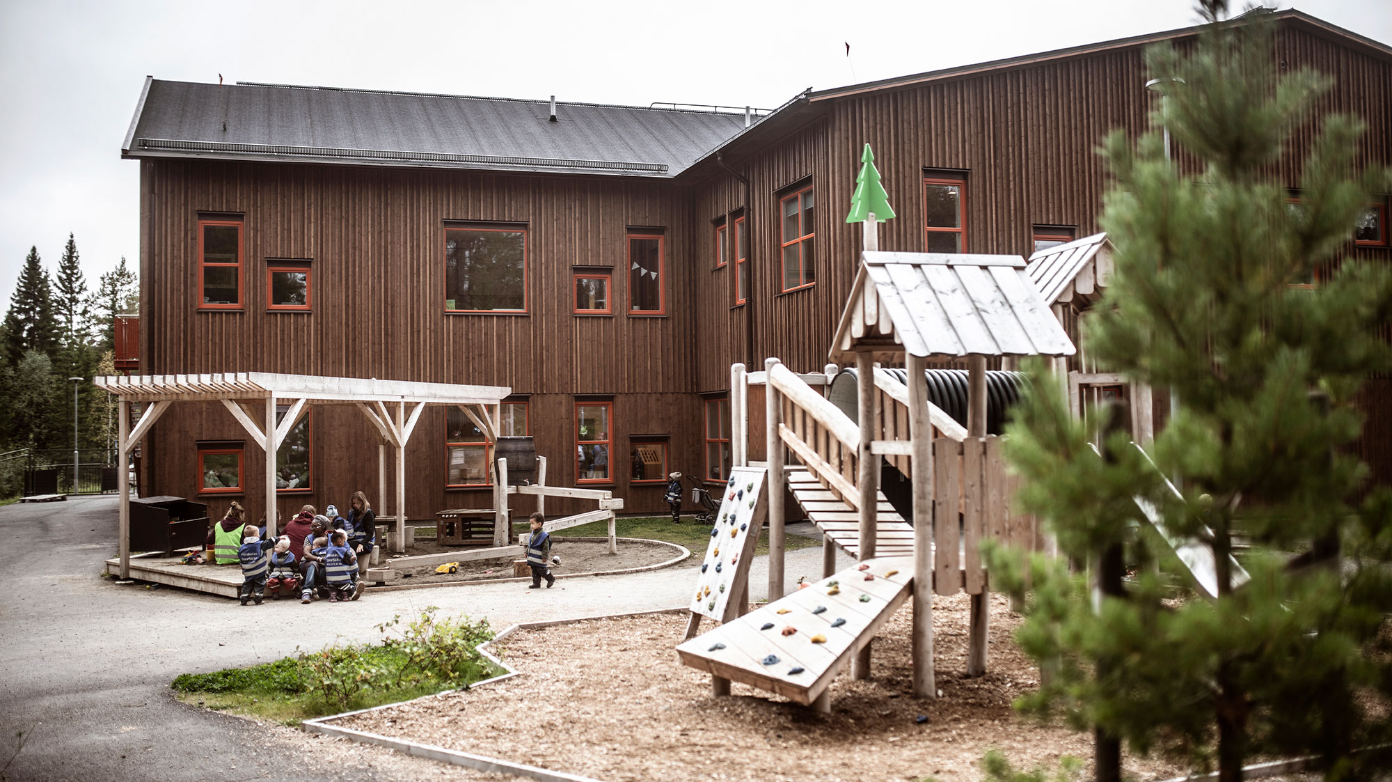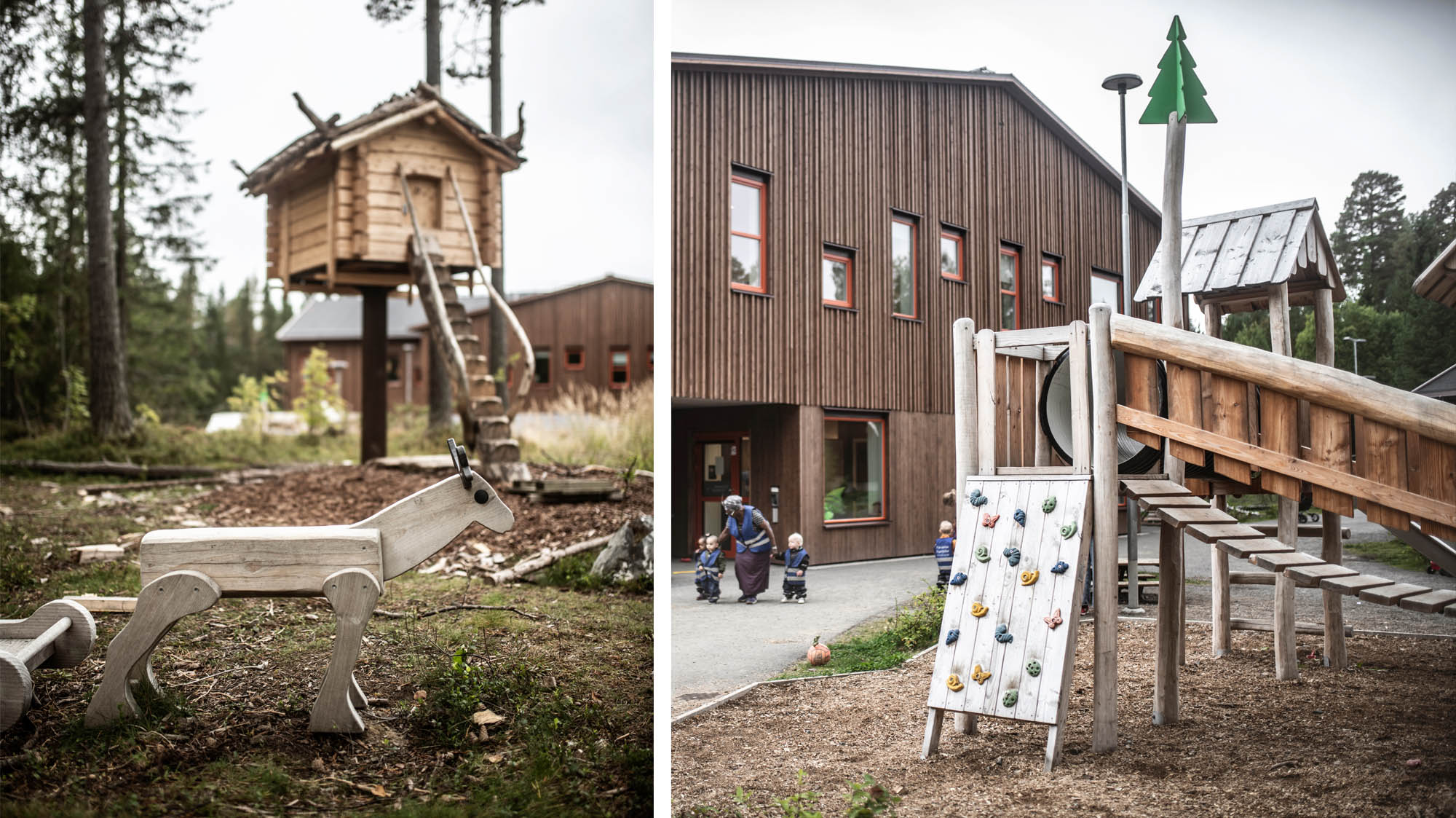 På gården samsas jämtska och sydsamiska inslag med förskoleklassiker som klätterväggar och hängbroar.