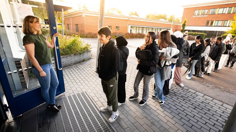 Läraren Lotta Berntsson på Bodaskolan i Borås står beredd att ta emot eleverna som ställt upp på led – en metod för att få arbetsro i klassrummet.