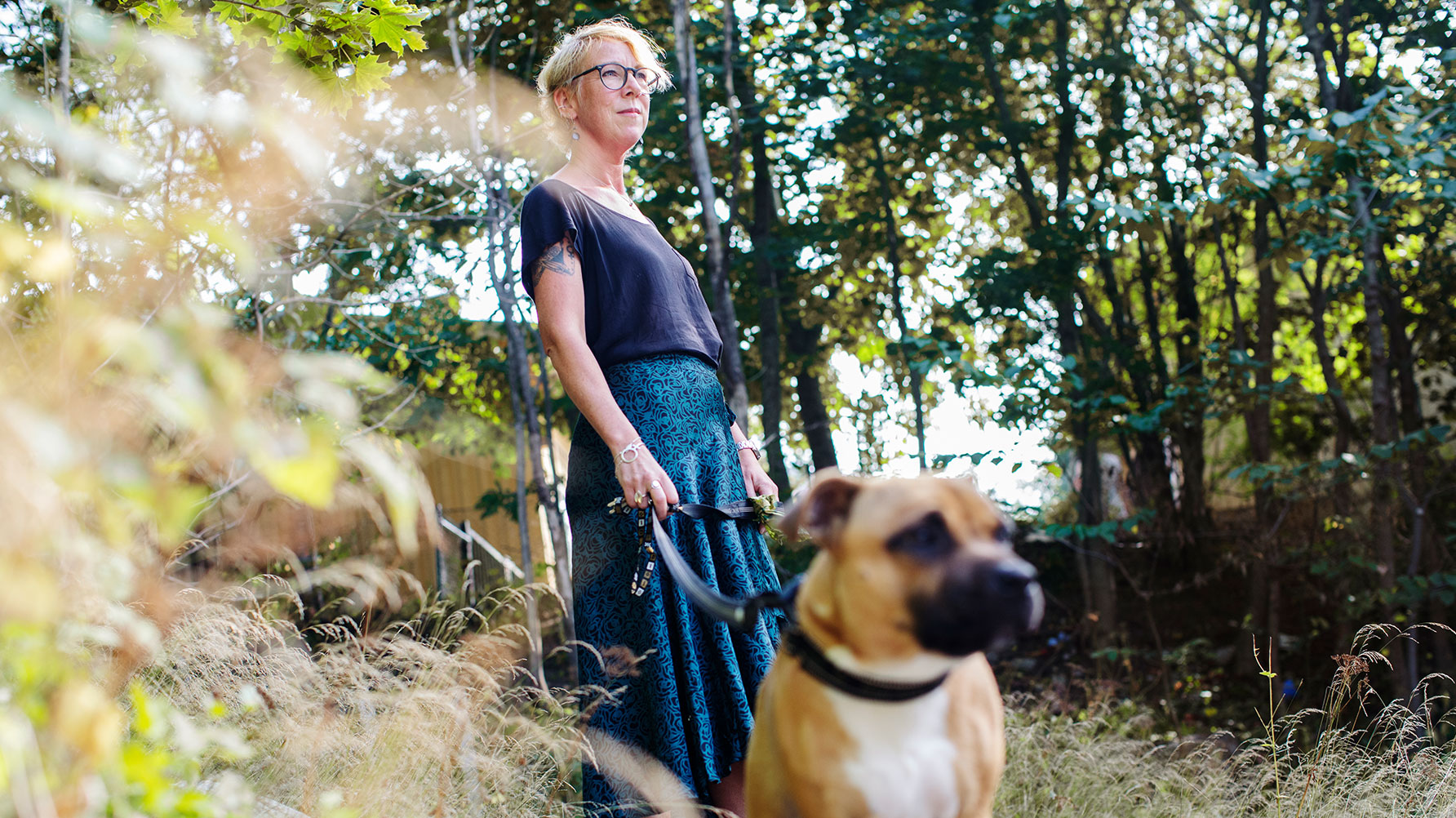 Maria Nordheden Gard, rektor, och skolhunden Iggy – en nio månader gammal Staffordshire bullterrier. Foto: Ylva Sundgren