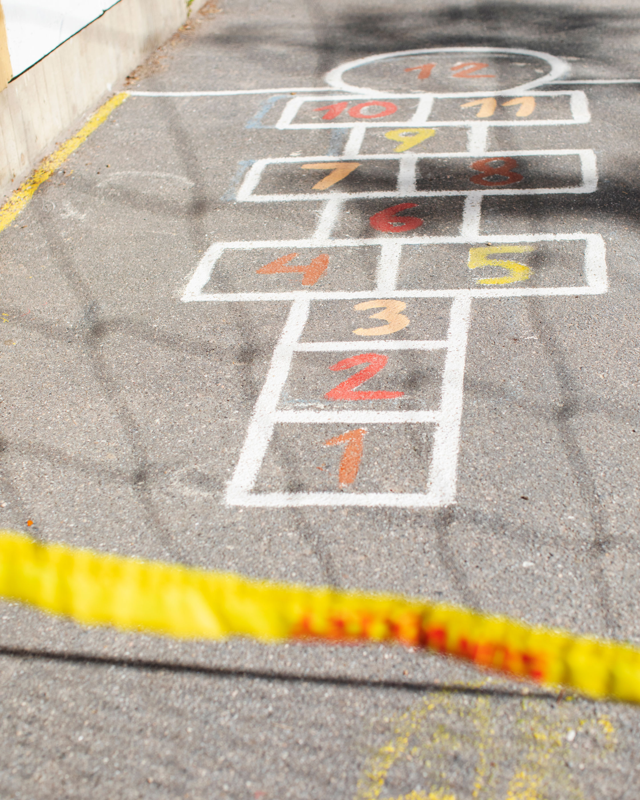 I samma stund glimtar några förskolebarn genom fönstret. De gungar. Vid ett upphängt nät spelar några äldre barn volleyboll. Några andra springer runt och leker kull.