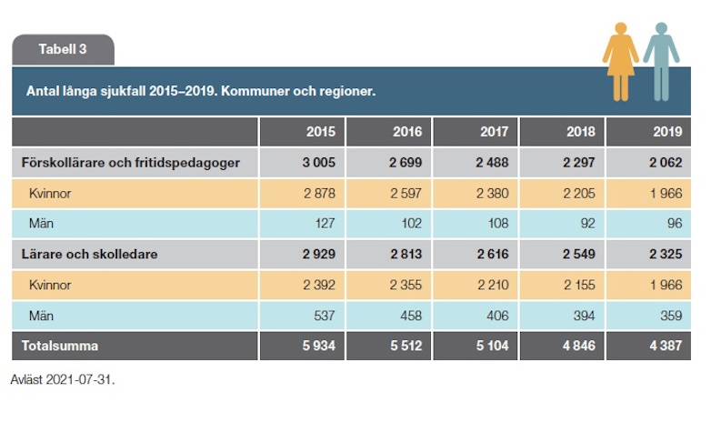 • För kvinnliga lärare/pedagoger anställda på skola eller skolledare har det kommit in mellan 1966 och 2392 långa sjukfall per år. För män varierar det mellan 359 och 537 fall per år (där motsvarar männen inom skolan 30 procent av de totalt antal anställda lärargrupperna och rektorerna).