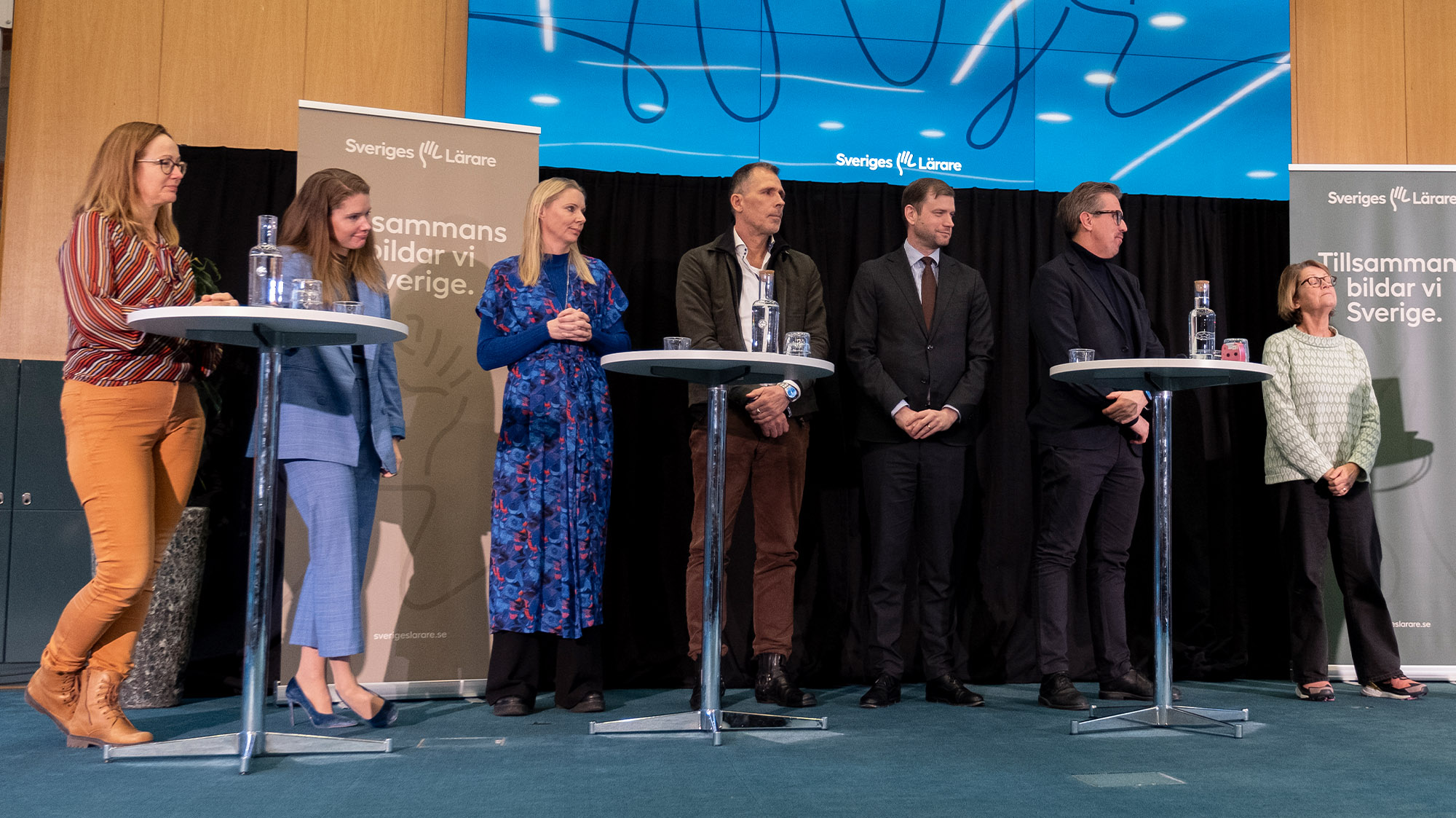 Sara Wettergren, Josefin Malmqvist, Åsa Westlund, Håkan Wislander, David Lindberg, Marcus Strömberg och Marianne Dovemark under Sveriges Lärares panelsamtal. Foto: Filippa Ljung.