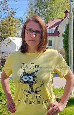Lärarna Katarina Wallner, lokalt skyddsombud för Lärarförbundet, och Therese Lindberg, lokalombud för Lärarnas Riksförbund, var tidigt på plats och satte sig snabbt ned vid skolminister Lina Axelsson Kihlbloms sida på Altinska skolans restaurang i Sundsvall. Med den ironiska texten ”It's fine, I'm fine, Everything is fine” på sina gula tröjor och motiv med en katt med rödsprängda ögon och en päls som stod åt alla håll ville de sammanfatta hur de just nu känner sig vid slutspurten på terminen.
