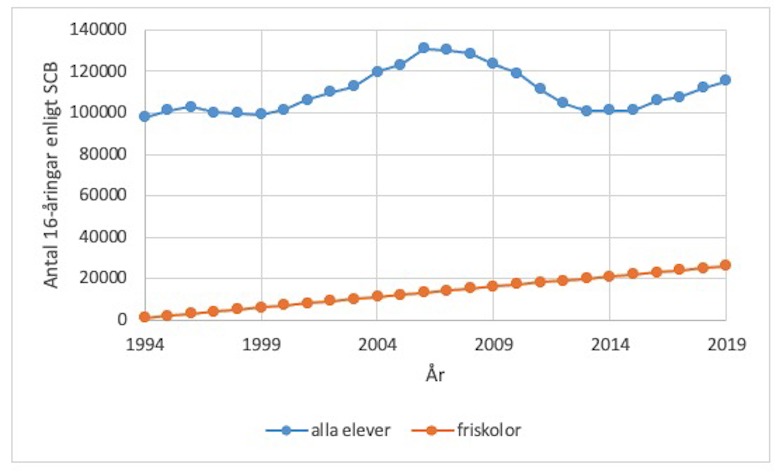 Vi gör nu ett tankeexperiment. Låt friskolorna ha 20 000 av en årskull, vilket det ungefärligen var åren 2007-2013. De kommunala skolorna måste då kunna hantera variationer mellan 110 000 elever år 2007 och 81 000 år 2013 och i procent blir tappet från 100 till 74 procent och ett genomsnitt över tid på 87 procent. Dessa beräkningar illustrerar två saker. För det första måste skolor med lagstadgat ansvar för demografiska variationer per definition ha överkapacitet och det kostar pengar. För det andra, ju större andel elever i friskola, desto större måste den kommunala skolans överkapacitet vara medan en friskola kan korta kön, hitta billigare lokaler eller i värsta fall gå i konkurs, som John Bauergymnasiet, och därmed lägga kostnaden på någon annan och låta andra ta hand om eleverna.
