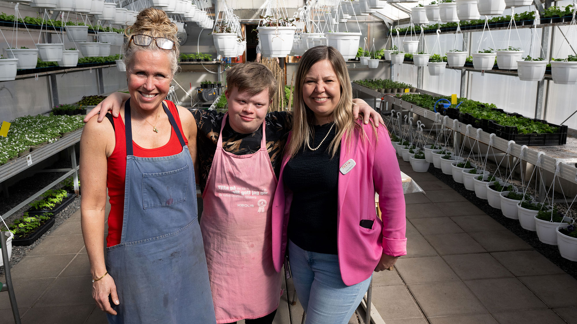 Växthuset är en integrerad del av verksamheten på det anpassade gymnasiet Freja i Mölndal. Diana Storvik med läraren Lotta Lindevy och eleven Linus.