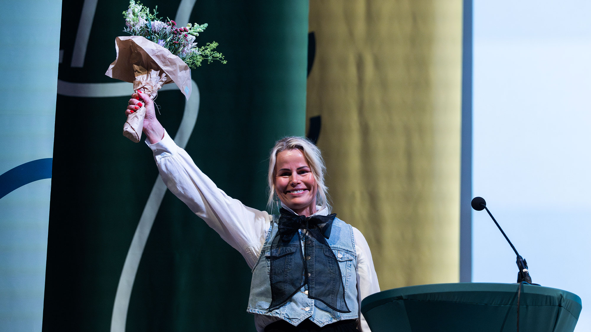 Anna Olskog på scenen efter att ha valts till ny ordförande. Foto: Magnus Andersson/Bildbyrån