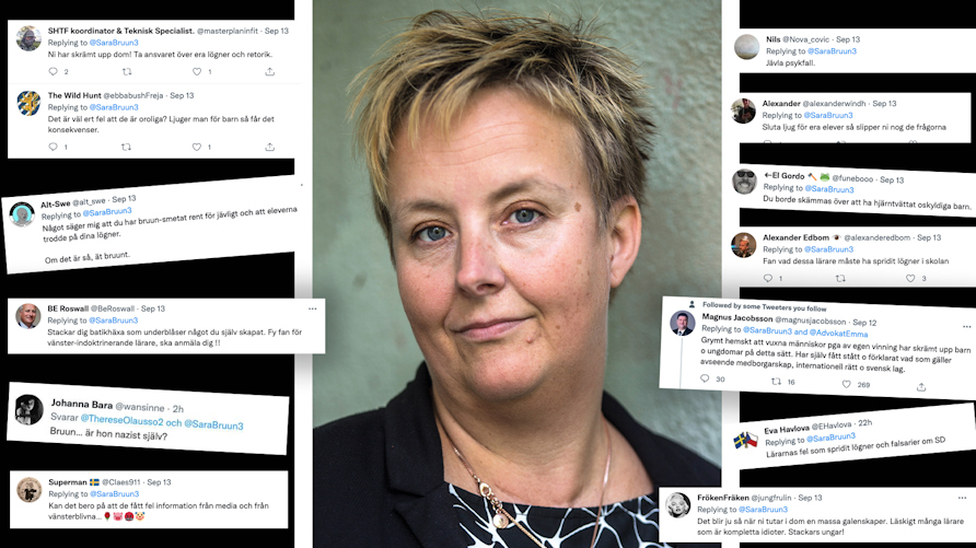 – Det är runt 500 kommentarer nu och majoriteten går ut på att lärarkåren är vänsterpatrask som lurat i barnen att det här ska hända, och att om vi inte hade ljugit för barnen hade de inte mått så dåligt. Och ett drev utan dess like inleddes mot mig som person, att jag inte borde få vara lärare, att jag jobbar med indoktrinering och propaganda. Och eftersom jag heter Bruun måste jag vara nazist, någon kallar mig Eva Braun, säger hon.