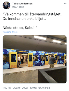 Tåget i fråga visade sig vara det ”återvandringståg” den Sverigedemokratiska riksdagsledamoten Tobias Andersson beskrivit i ett kritiserat twitterinlägg den 16 augusti: Ett foto av ett tunnelbanetåg helt klätt i partiets färger och symboler, och texten ”Välkommen till återvandringståget. Du innehar en enkelbiljett. Nästa stopp, Kabul!”