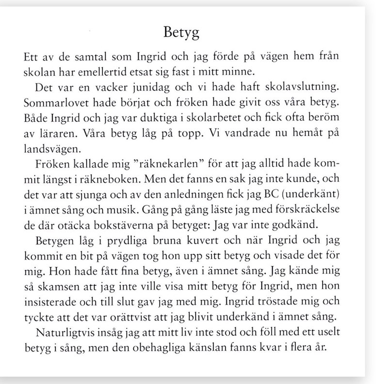 Faktum är att jag efter denna dag slutade att sjunga. Helt omusikalisk är jag inte, men betyget BC medförde att jag inte längre deltog aktivt i allsång eller skolans psalmsång; möjligen rörde jag på läpparna, men något sjungande bidrog jag inte med. Jag var ju underkänd.