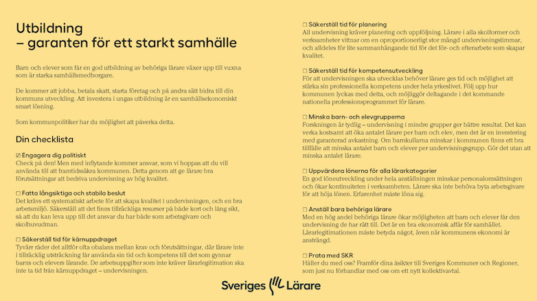 Sveriges Lärares checklista ”Hej kommunpolitiker!" innehåller nio krav. De kan sammanställas till ett enda: ”Låt oss vara lärare”.