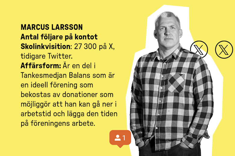 På Twitter, eller X som Elon Musk döpt om kanalen till, verkar läraren Marcus Larsson med sitt konto Skolinkvisition som har 27 300 följare.