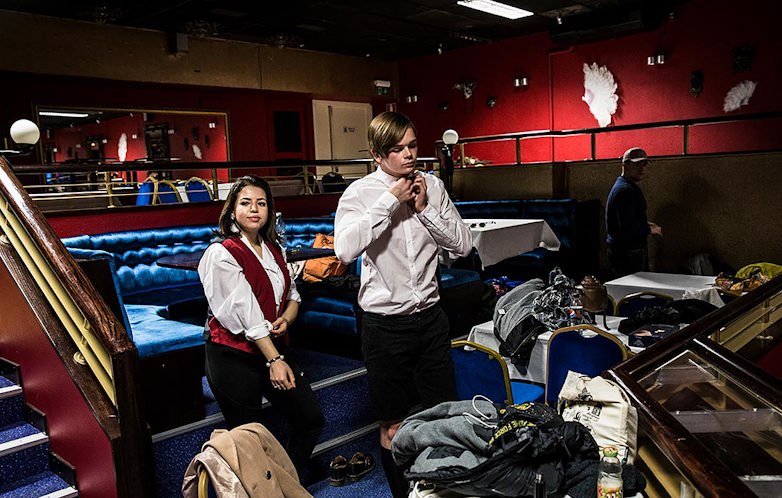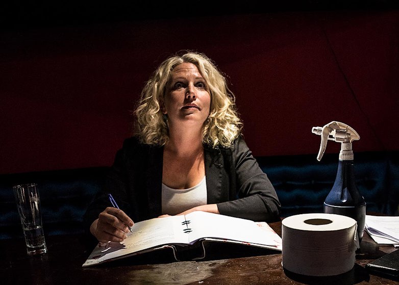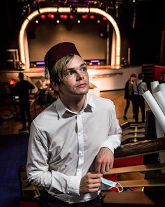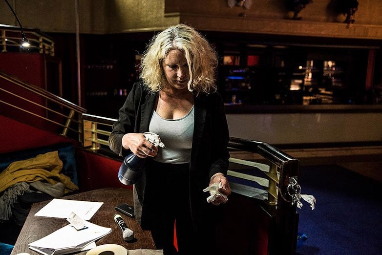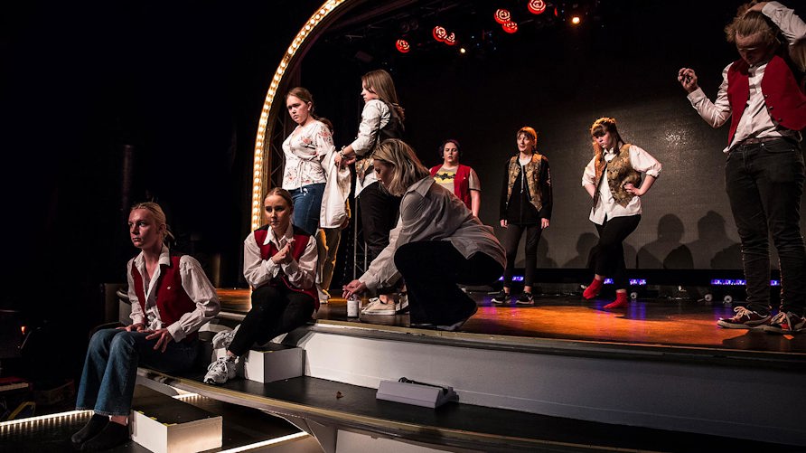 Sara Olrog ordnar med pappersarbete under tiden som repetitionerna pågår på scenen några meter bort. Det har blivit en hel del extra arbete för att få ihop den nya musikalplanen. Bland annat har komplexa scheman lagts för att eleverna ska kunna repetera med så låg smittorisk som möjligt. Foto: Jesper Klemedsson