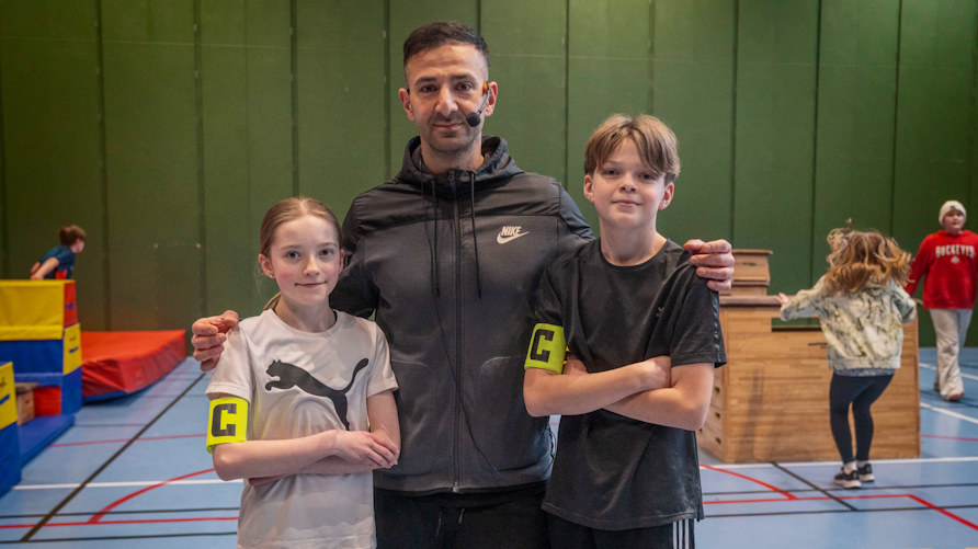 Idrottsläraren Ara Sarkisian tillsammans med elevkaptenerna Siri Palmblad och Alfred Blombergsson i klass 5C på Uppsävjaskolan i Uppsala.