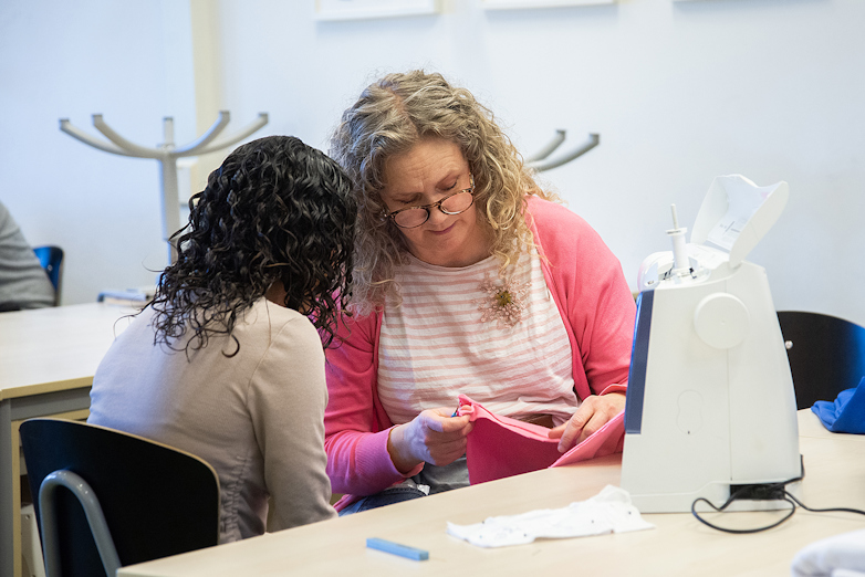 Textilläraren Annette Lindkvist instruerar en elev. Foto: Jakob Hydén