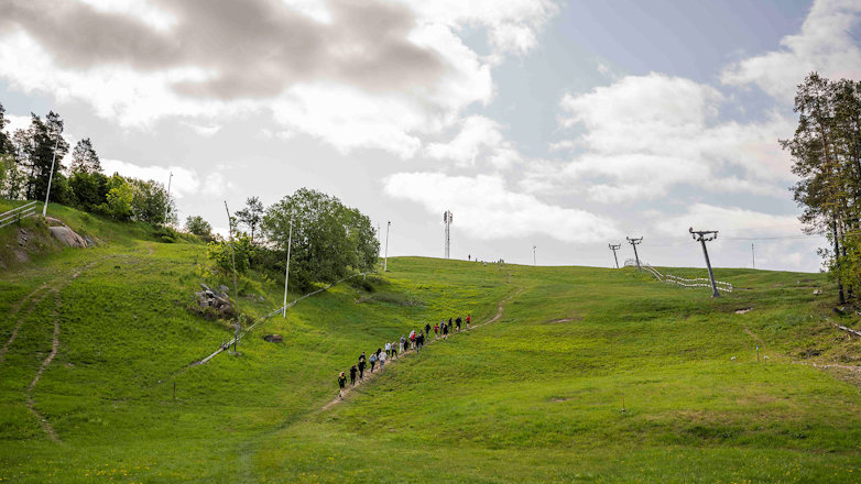 Backen ser inte ut att vara så brant. Särskilt inte nerifrån. Men den är seg, lång och underlaget är ojämnt och svårbemästrat. Varje gång någon av eleverna passerar Anders Erlandsson och kan vända neråt igen, prickar han av dem och ropar med lite hes röst saker som: ”Ruggigt imponerande, Lindor” eller ”Bra, du är en riktig kämpe, Wilma”.