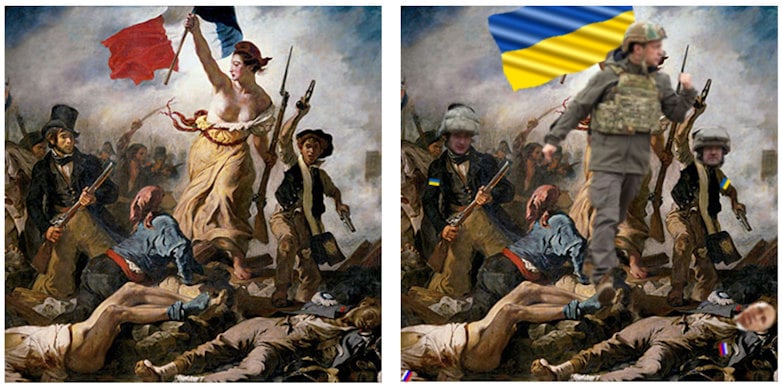 En tredje har valt Eugène Delacroixs världskända målning från franska revolutionen och placerat Ukrainas president Volodymyr Zelenskyj i mitten och Vladimir Putin utslagen intill.