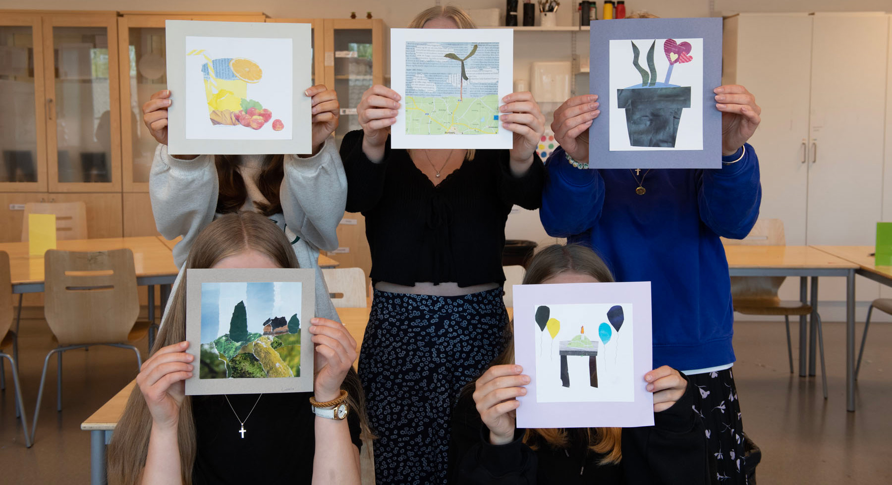 På Trollehöjdskolan i Mullsjö har bildläraren Therese Ludvigsson lektion med en niondeklass. Det är en del av projektet som hon kallar för ”Tryck, kollage och slumpen”. Den senaste lektionen pratade de om komposition och då skulle de tänka på att placera sina objekt där linjerna möts.