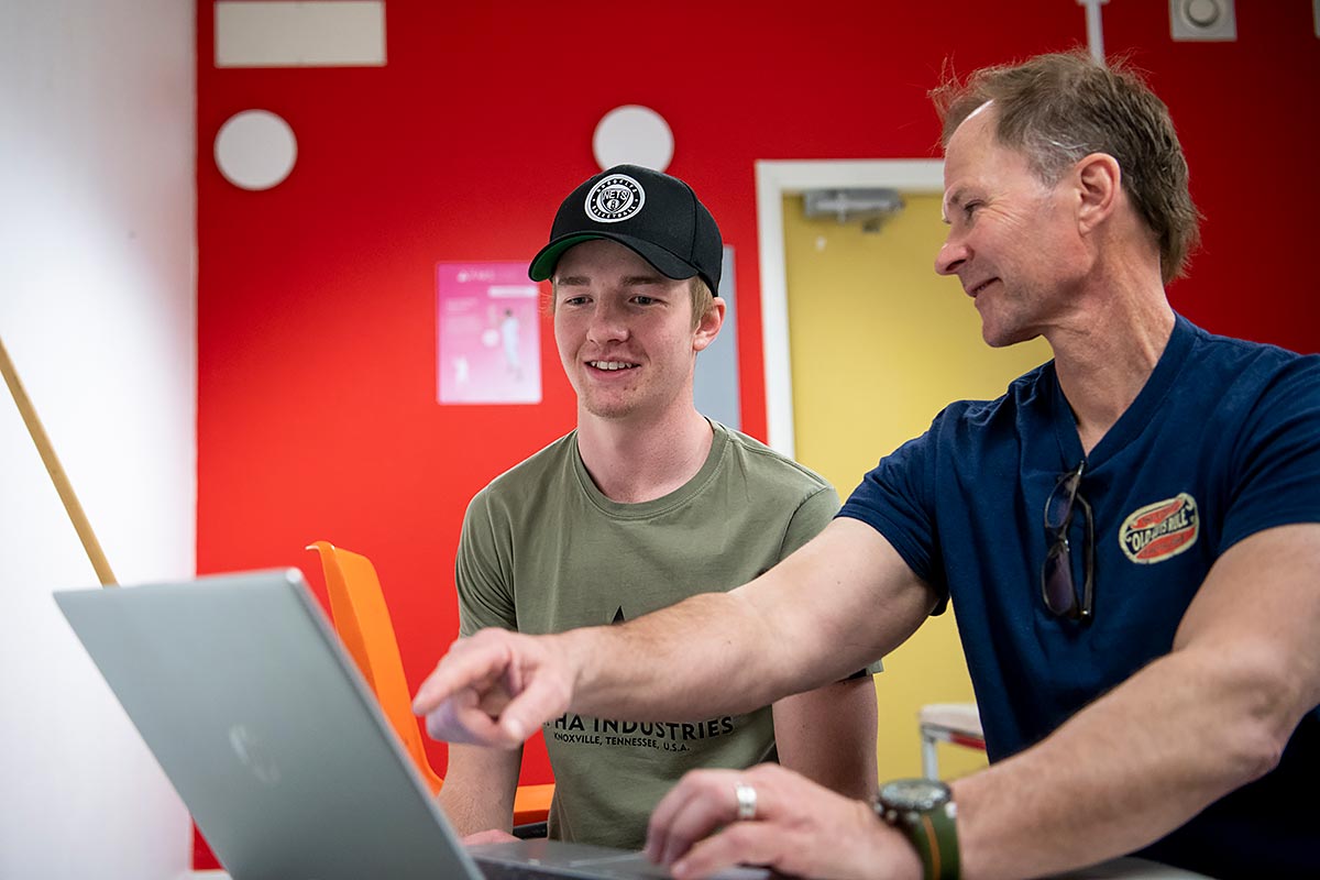 Läraren Anders Knoph och eleven Martin Stålhandske kollar på skärmen. I programmet ska eleverna göra en livsstilsplan med tre olika mål. Foto: Fredrik Karlsson