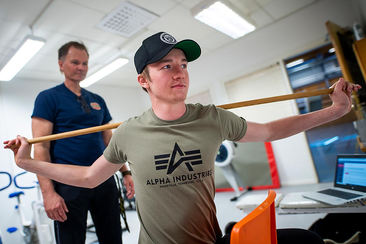 Rörlighetstester samt tester för motorik är några av dagens övningar. Här är Martin Stålhandske vid en av stationerna medan hans lärare Anders Knoph har koll i bakgrunden. Foto: Fredrik Karlsson