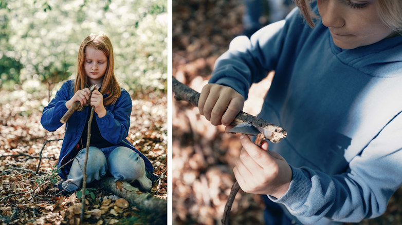 Det är en entusiastisk skolklass som uppenbarligen gillar att ha sin slöjdlektion i skogen. Några provar varandras verktyg för att se vilken modell som är mest effektiv, andra täljer ihärdigt med sina egna verktyg tills grillpinnen är klar.