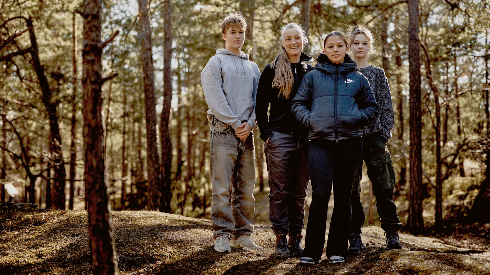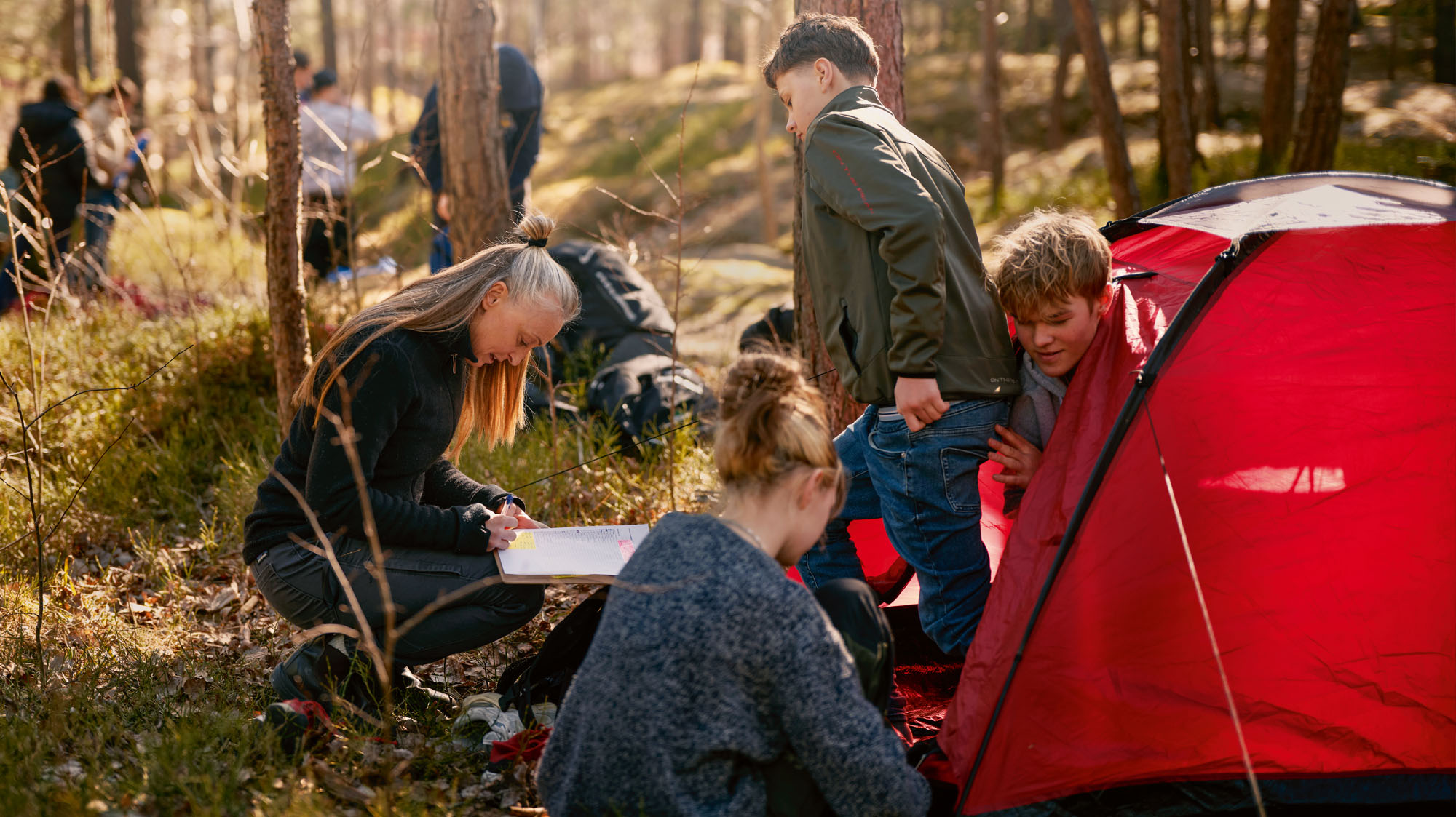Idrottsläraren Ulrika Westman tillsammans med Glenn Hultén, Elina Camara och Disa Lorentzon som får träna på att slå läger i ett grönområde mellan flerbostadshusen i södra Stockholm.