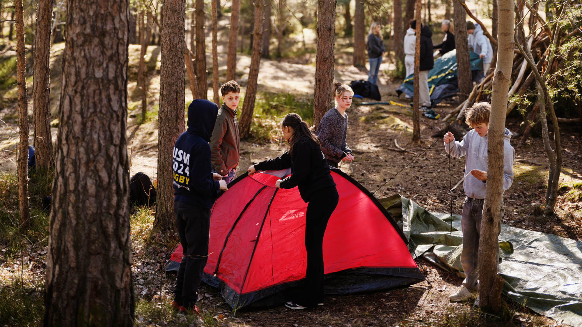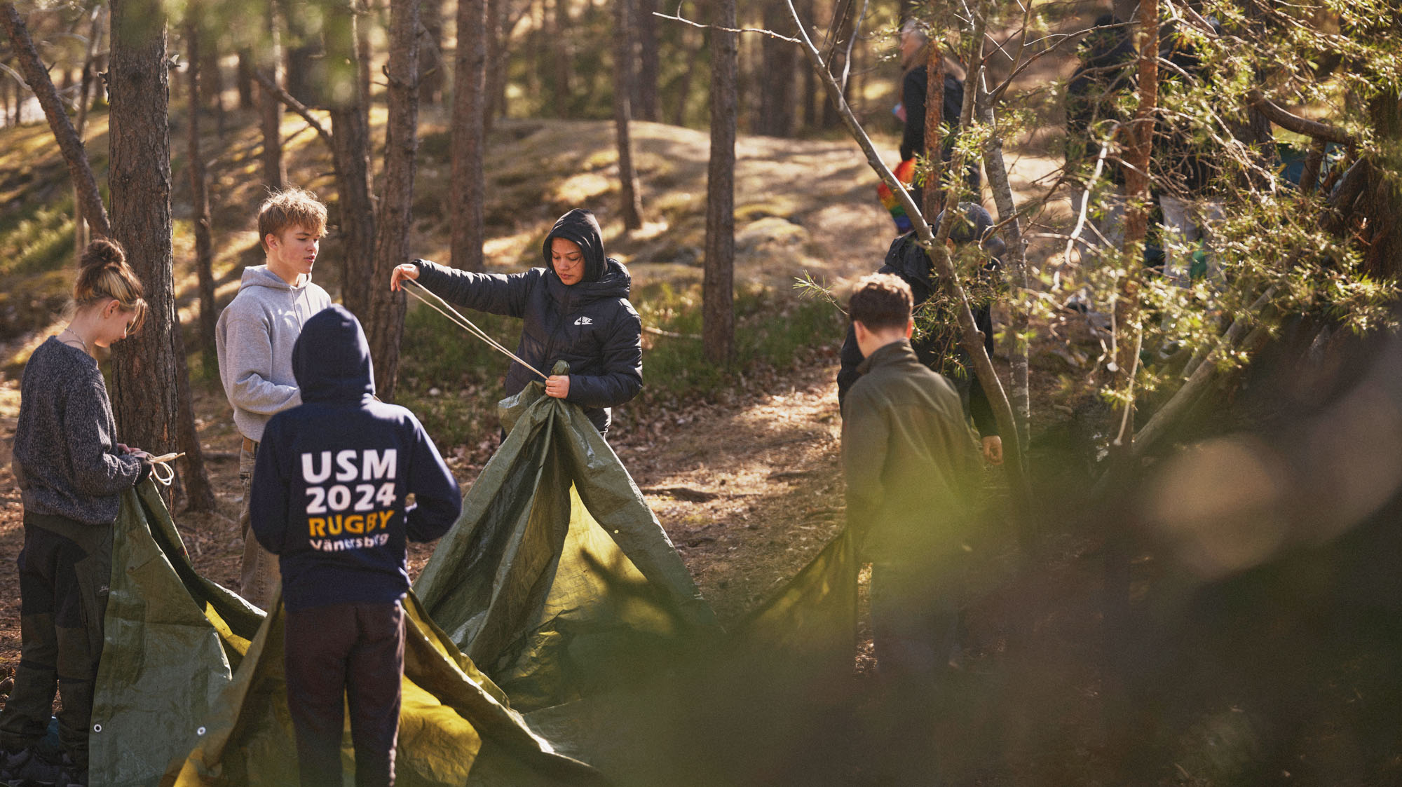 En grupp hittar snabbt en plan yta mellan några tallar där de börjar packa upp utrustningen tillsammans. När de slagit ned sista pinnen i marken gör de high five och kryper in genom tältöppningen.