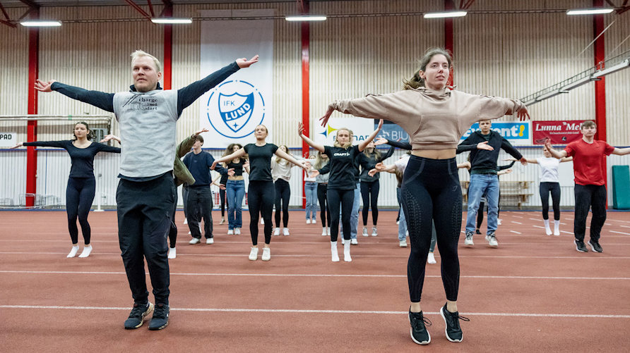 Polhemskolan har ingen egen idrottshall så det bär av till en idrottsanläggning på andra sidan vägen. Här möts man av en doft av gummi. Det är en friidrottshall och hela lokalen är belagd med gummimatta. Eleverna tränger ihop sig på höjdhoppsmattan. Mikaela Hilbertsson frågar hur de mår och berättar att de ska inleda med dans, först line dance och sedan den redan inövade ”dansa för livet”-dansen.
