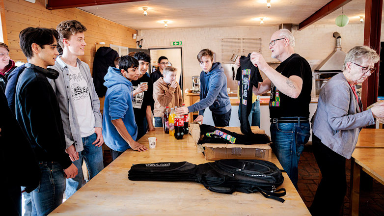 Hon syftar på körens egen t-shirt, där flera av körmedlemmarna är avbildade. Flera av eleverna satte på sig tröjan direkt, uppenbart stolta att bära porträtten av både 70- och 80-åringar och att vara en del av samma kör.