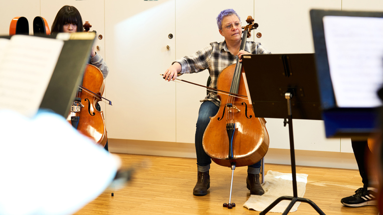 – Det eleverna får uppleva är väldigt likt hur det är i en professionell orkester. Vi repeterar från måndagen och har konsert på fredagen. Målet är väldigt konkret. Eleverna har olika förkunskaper. Många har aldrig sett en dirigent innan, säger Mia Blomquist, instruktör för celloeleverna.