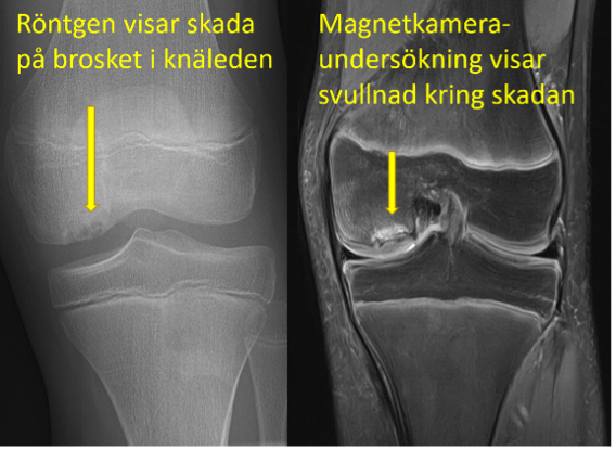 Svullnad i eller kring en led kan tyda på blödning eller inflammation. Om svullnaden uppstår efter ett trauma kan man utgå från att det beror på en blödning, och att en struktur i leden är skadad. Ett svullet knä efter en skada kan indikera skada på brosk, ligament eller menisk. Detta kräver en noggrann utredning, ofta med båda vanlig röntgen, för att visualisera skelettet och magnetkameraundersökning, för att se mjukare strukturer. Svullnad som uppkommer utan trauma kan bero på bakterieinfektion, autoimmun sjukdom eller inflammation. Det krävs blodprovtagning för att skilja dessa åt.