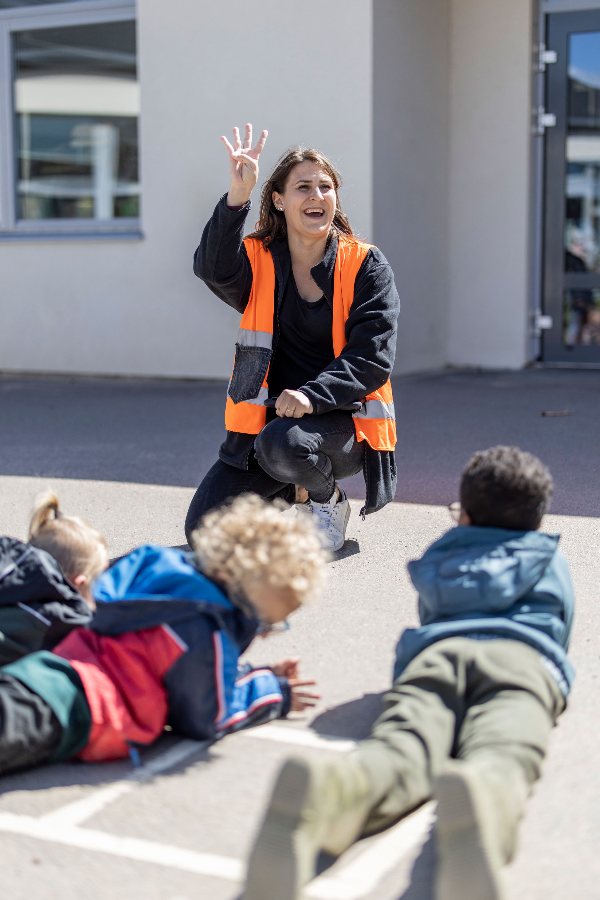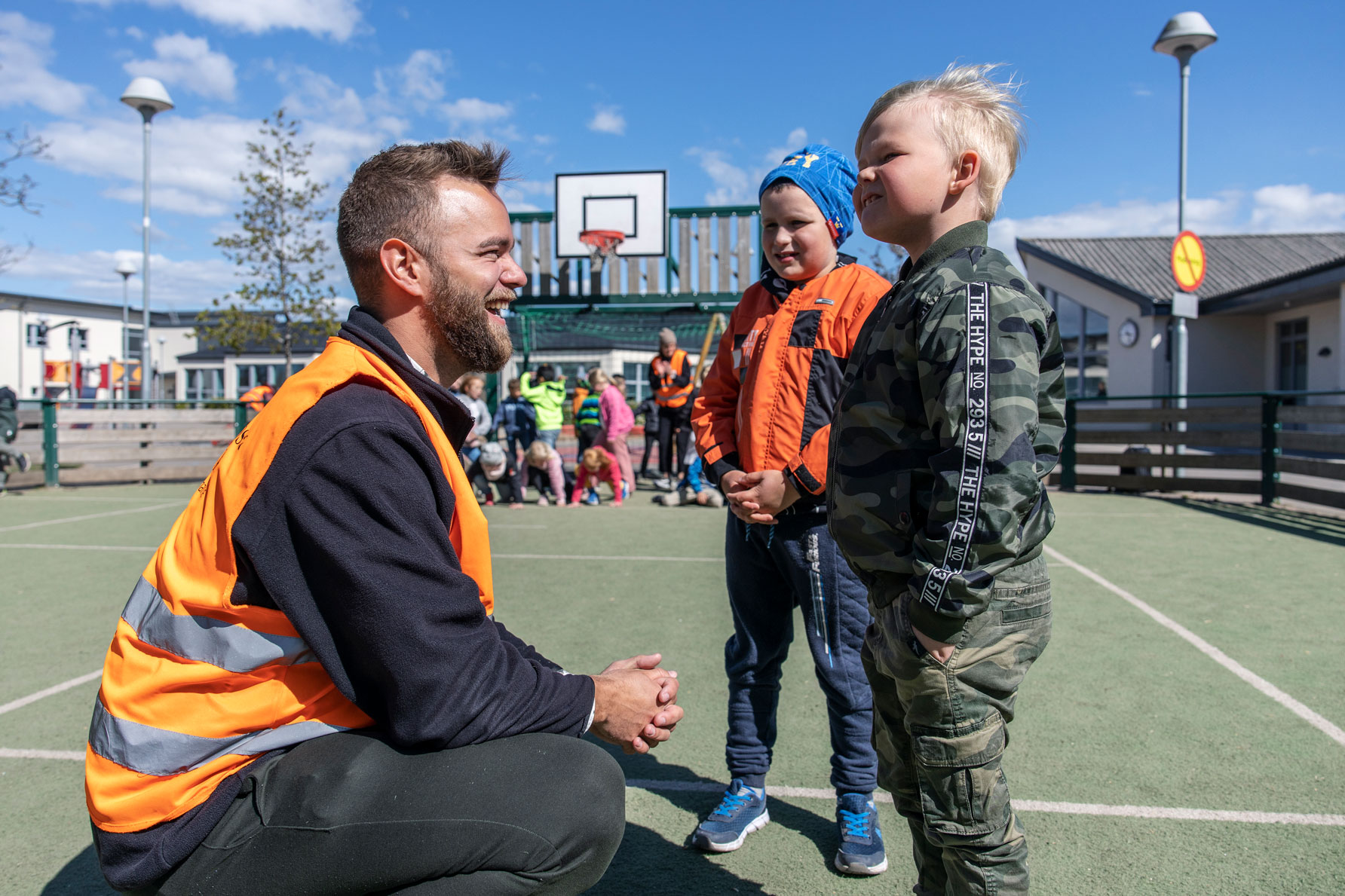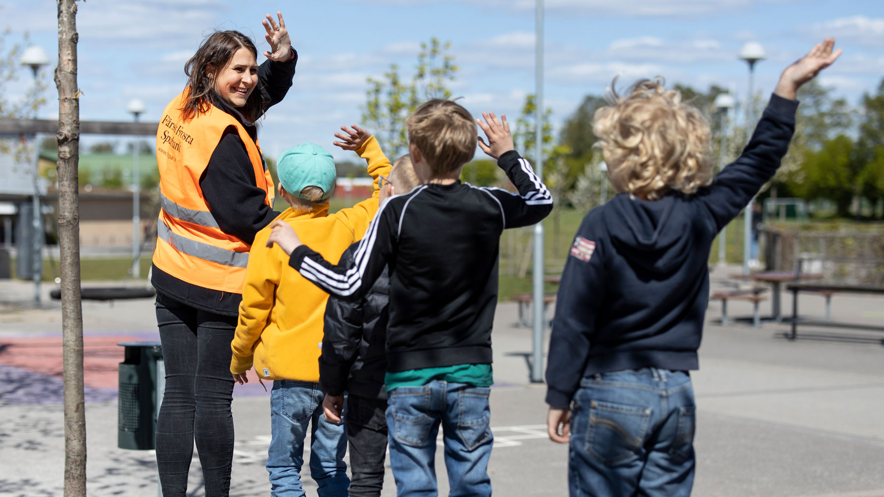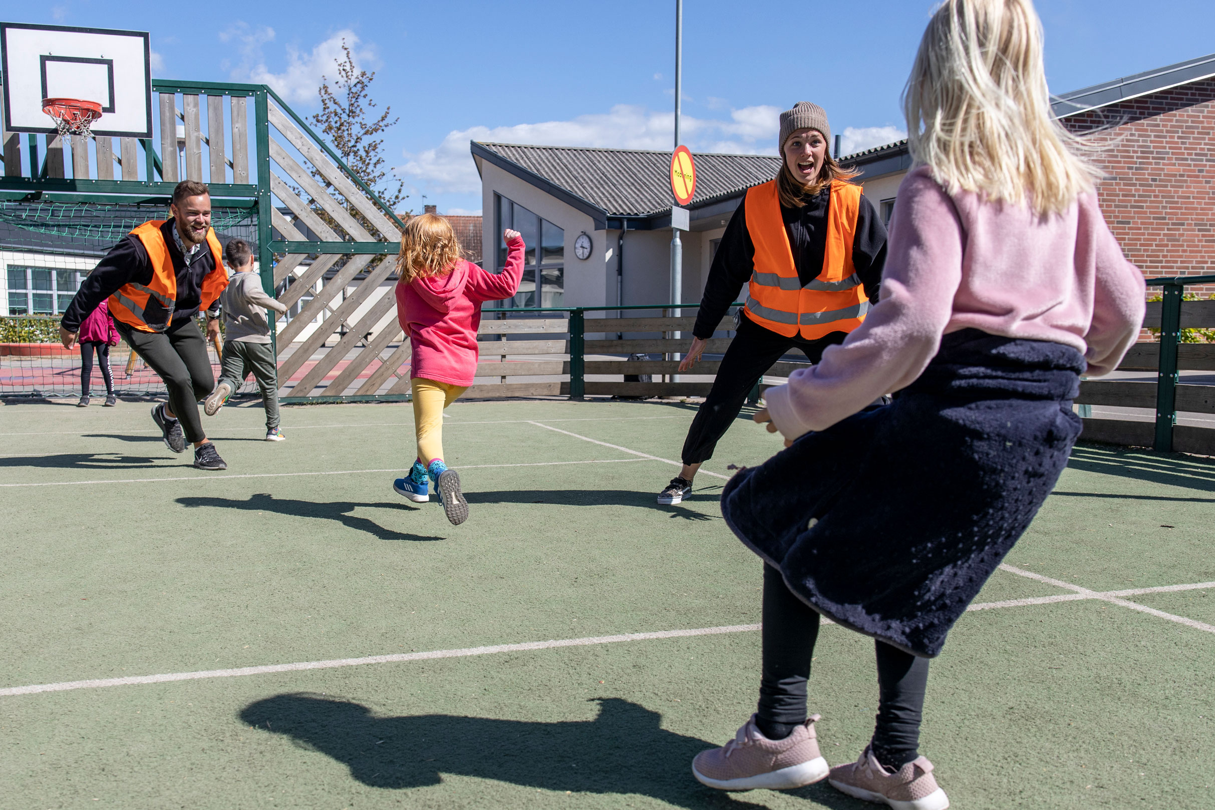 Ute på gården springer såväl Linus Nilsson som Nanna Nilsson sig svettiga. De är närvarande i leken tillsammans med barnen. Emma Gustafsson har dagens ”pricka av-ansvar” och står lite vid sidan av med den digitala listan. Hon säger adjö till dem som hämtas och tar sig god tid att småprata med vårdnadshavare.