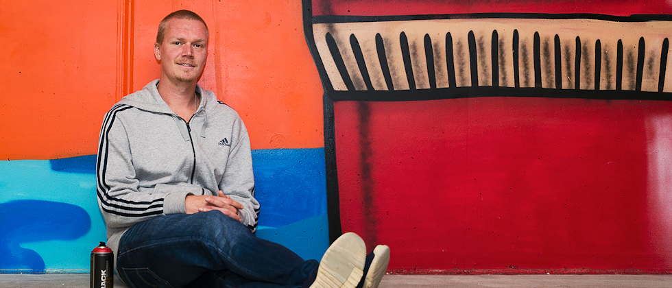Lektionslyftet Bildläraren, konstnären och illustratören Jonatan Wiegert har sysslat med street art och graffiti sedan tonåren. Numera låter han eleverna spraymåla på bildlektionerna.