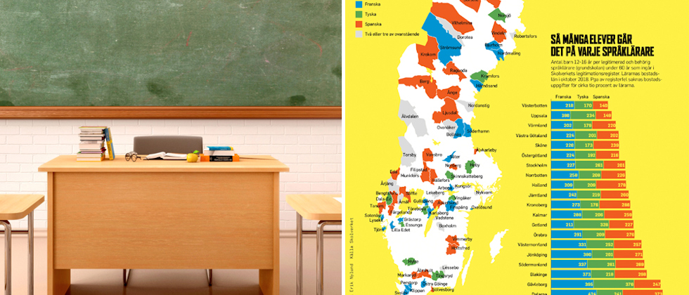Reportage + grafik Bristen på behöriga lärare i moderna språk blir allt mer akut. Läsåret 2017/2018 fanns det i 80 svenska kommuner ingen behörig undervisande högstadielärare i antingen tyska, spanska eller franska. Dessutom är många språklärare på väg att gå i pension.– Vi närmar oss en språkkatastrof, säger Christina Rosén som är lektor i tyska på Linnéuniversitetet i Växjö.