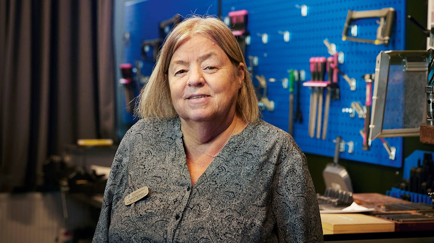 Lindholmens vägledare Katrin Karlsson på verkstadsgolvet. Foto: Anna-Lena Lundqvist.