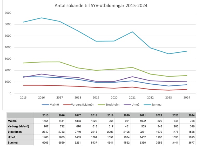 Hösten 2015 hade de tre studie- och yrkesvägledarprogrammen i Stockholm, Malmö och Umeå sammanlagt 6 200 sökande. Tio år senare har siffran dalat till 3 700.