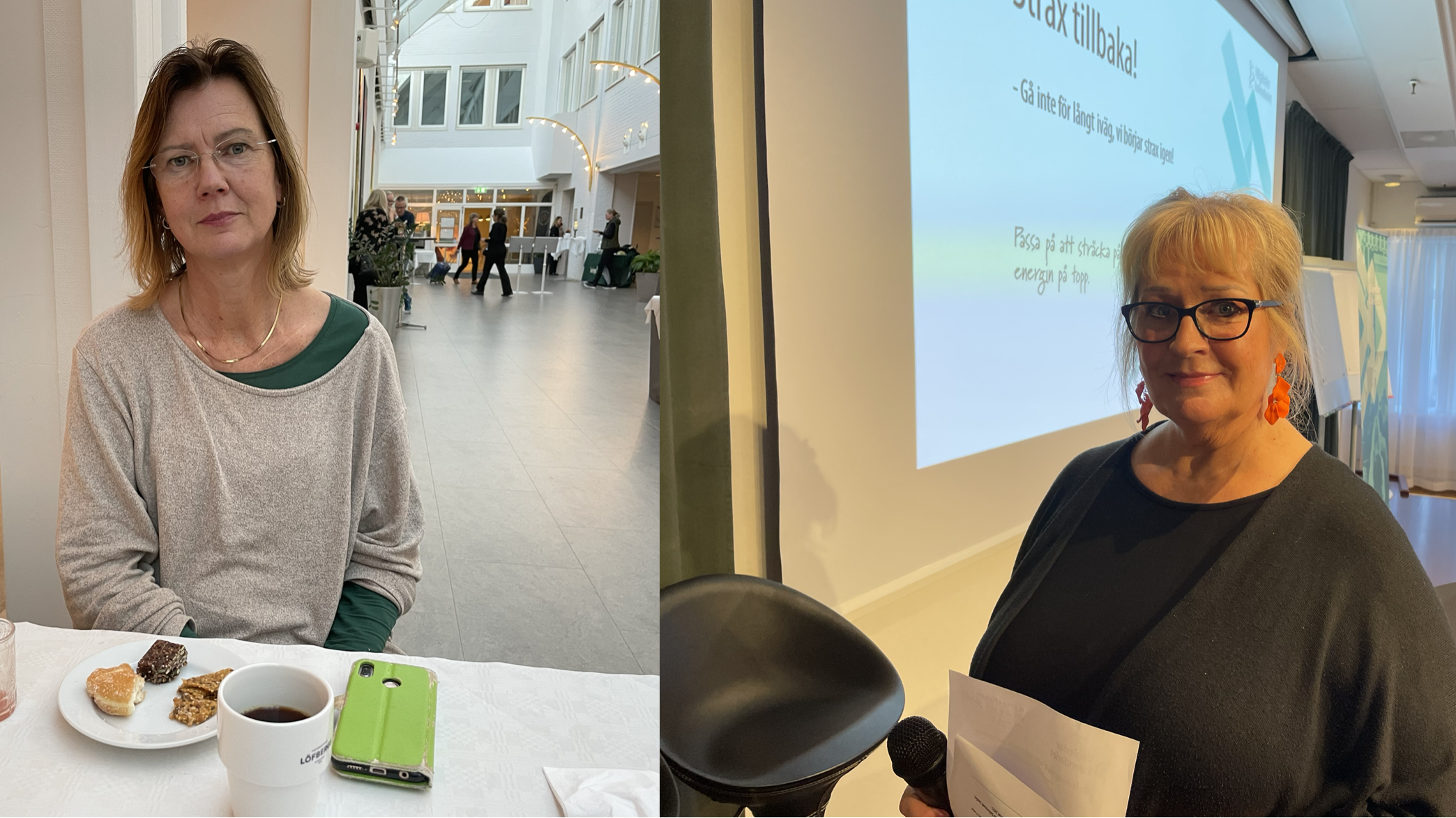 Vänster: Ramona Nyström Idevik var är på plats tack vare att Järfälla kompetenscentrums vuxenutbildning har konferensabonnemang. ”Det som lockade mest i dag var det här med utlandsjobb. Och Anders Lovén såklart! Honom vill man ju inte missa.” Höger: Programansvariga moderatorn Jenny Ivarsson konstaterade att konferensen krockade med både internationell vägledarkonferens i Finland och kursslutsarbete för komvux … mitt i influensatider. ”Det är olyckligt när det krockar så här. Men jag påminner om att de som abonnerar på våra konferenser har möjlighet att ta del av en inspelning av den under en vecka via länken på vår hemsida.”