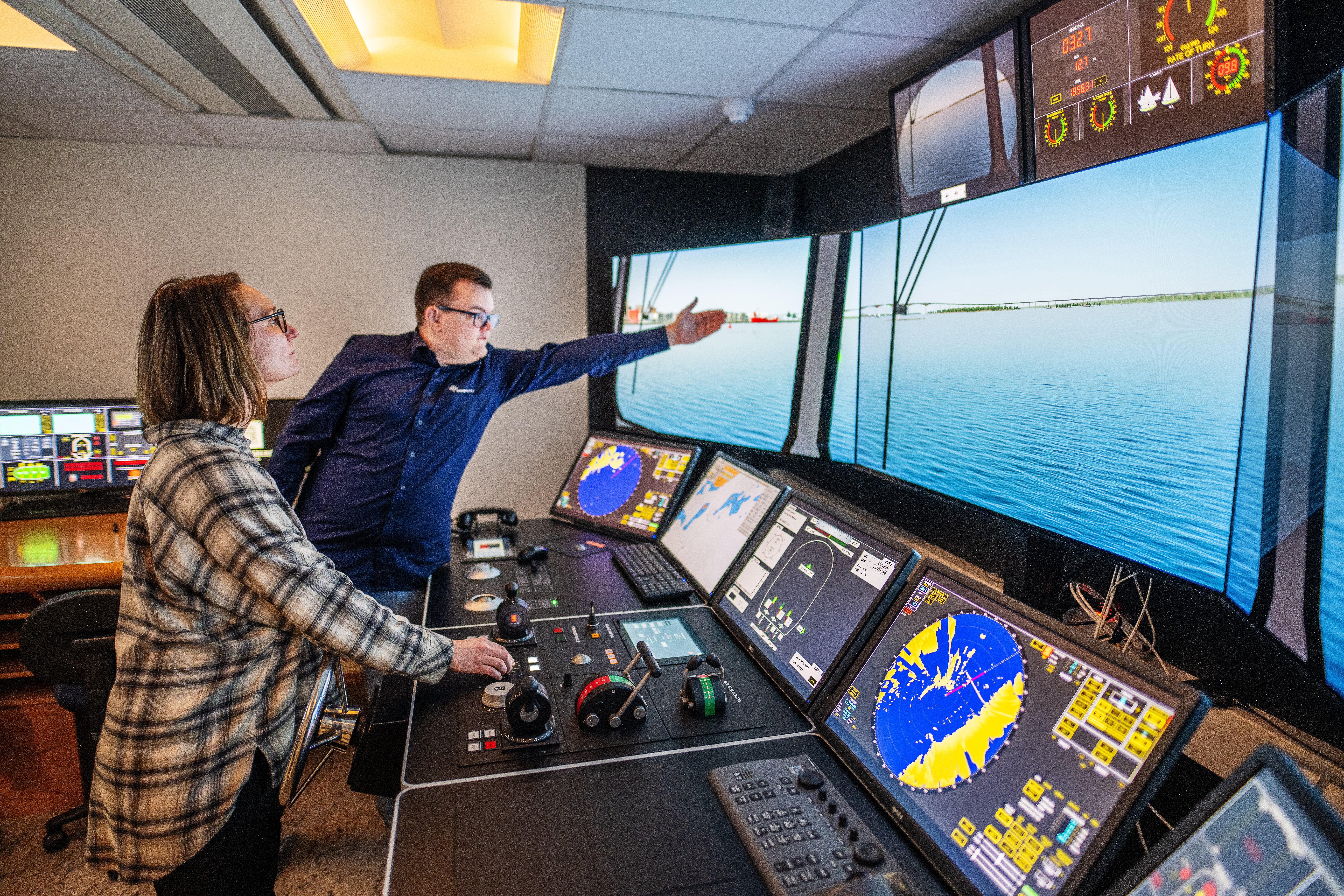Amanda Köhler övar i simulatorn på att lägga till ett fraktfartyg vid kaj.